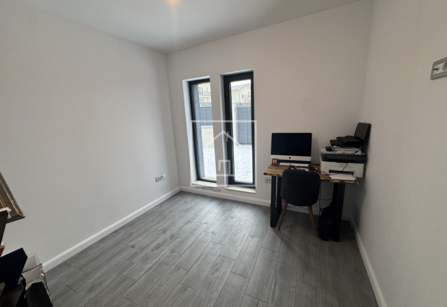 Parterul este conceput ca zona de zi si zona functionala. Aici regasim un living cu bucatarie open space in suprafata de 33 mp, cu iesire directa pe terasa exterioara de 9,3 mp, un hol de acces cu casa scarii de 6,8 mp, scara interioara de 4,3 mp, o baie cu geam de aerisire si cabina de dus de 3,6 mp, un dormitor sau birou de 10,2 mp, ideal pentru oaspeti sau lucru de acasa, precum si un garaj inchis de 19,3 mp, cu acces direct in casa si usa glisanta automata. Parterul beneficiaza de acces din trei puncte diferite, doua pietonale si unul direct din garaj, un detaliu rar si extrem de practic.