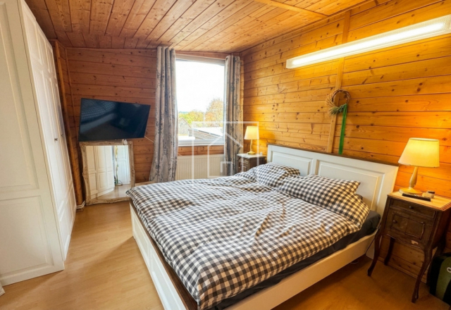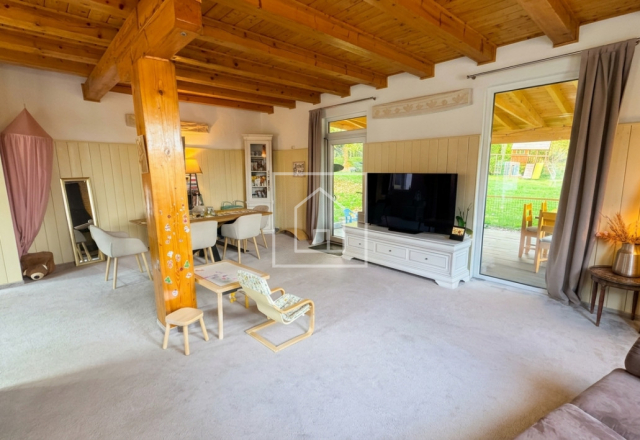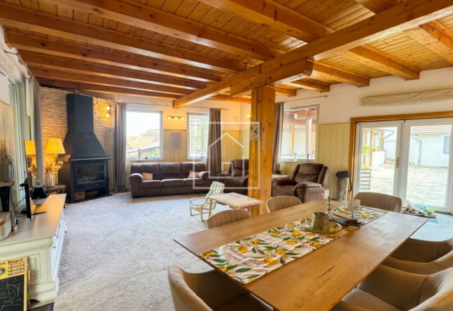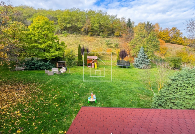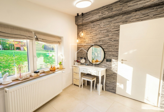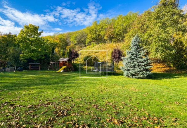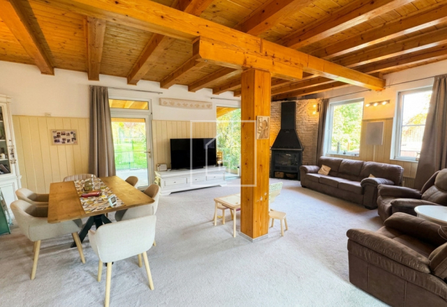 - Casa principala dispune de un living spatios, luminat natural, cu semineu marca Godin (made in Franta), care creeaza atmosfera perfecta pentru serile petrecute in familie. Din living se acceseaza terasa acoperita, cu vedere spre o gradina de vis de 3.800 mp, unde gasim pomi fructiferi, loc de joaca pentru copii, teren de baschet, un paradis natural la margine de padure, care garanteaza intimitate deplina.