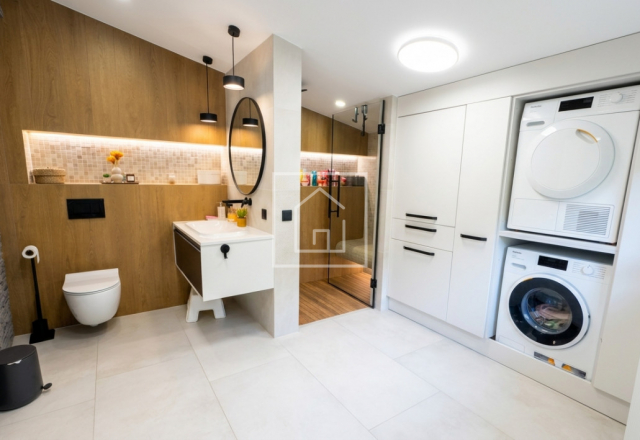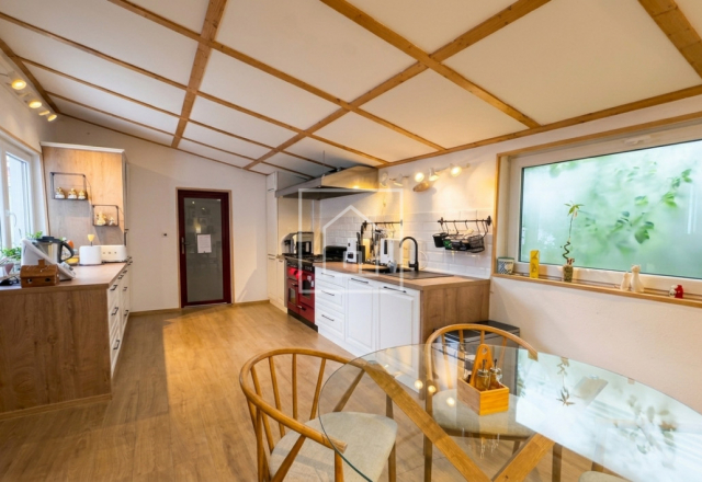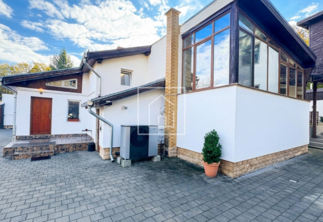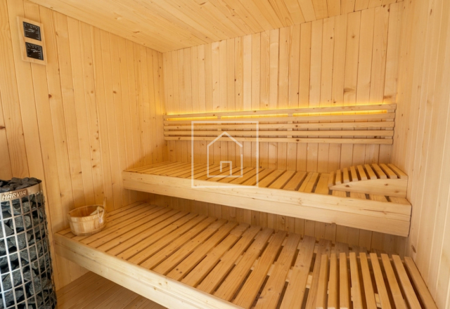 - Corpul secundar este dedicat relaxarii si socializarii: living generos cu bucatarie open space, trei dormitoare, baie completa, grup sanitar de serviciu, o zona wellness privata dotata cu piscina interioara incalzita (9m x 4m, 1,5m adancime / 54 mc de apa) si sauna uscata cu soba electrica Harvia (pana la 90°C).