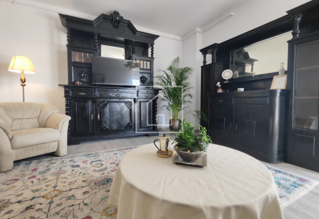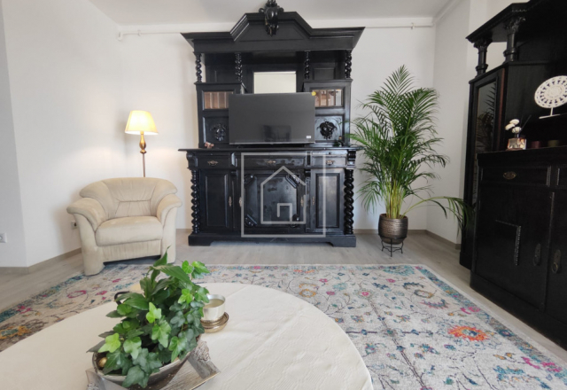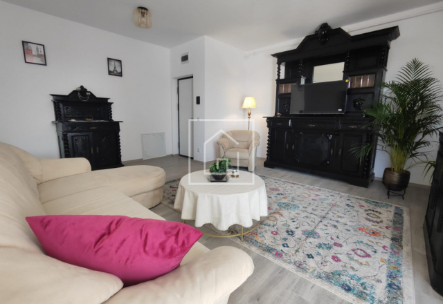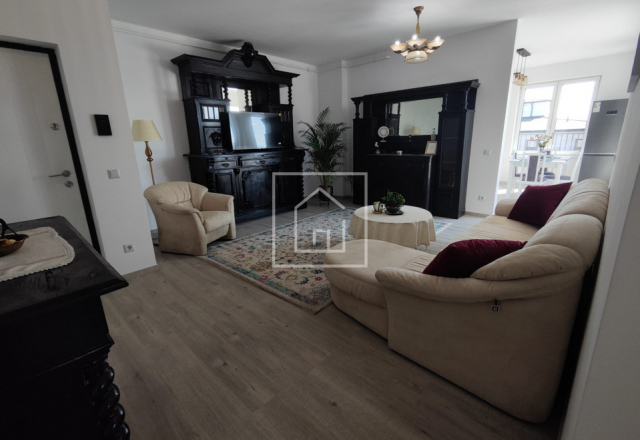 Apartamentul beneficiază de o compartimentare avantajoasă. Accesul se face direct într-un living spațios, amenajat într-un stil aparte, ce îmbină mobilierul clasic recondiționat cu elemente moderne. În continuarea zonei de zi se află bucătăria, complet mobilată și utilată cu toate electrocasnicele necesare: combină frigorifică, hotă, cuptor, mașină de spălat vase, mașină de spălat rufe, cafetieră, cuptor cu microunde și alte dotări esențiale.