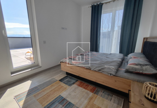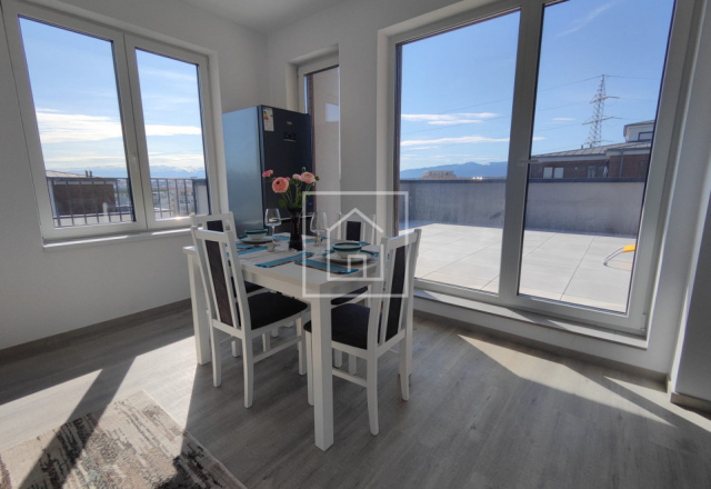 Unul dintre punctele forte ale proprietății este terasa de 40 mp, accesibilă atât din bucătărie, cât și din dormitor. Aceasta este amenajată cu pardoseală flotantă și oferă o priveliște deschisă spre munți și oraș, reprezentand locul ideal de relaxare. Spatiul acesta deschis este foarte frumos, util si adaptabil.