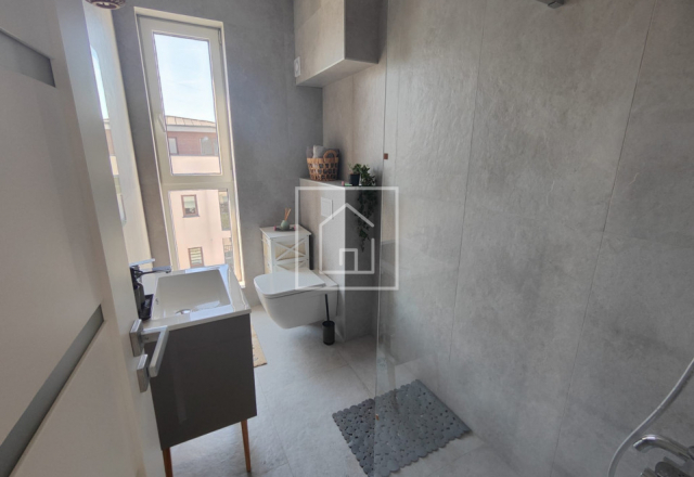 Baia este dotată cu cabină de duș cu scurgere directă, geam pentru aerisire și mobilier specific, gresia si faianta avand nuante placute.